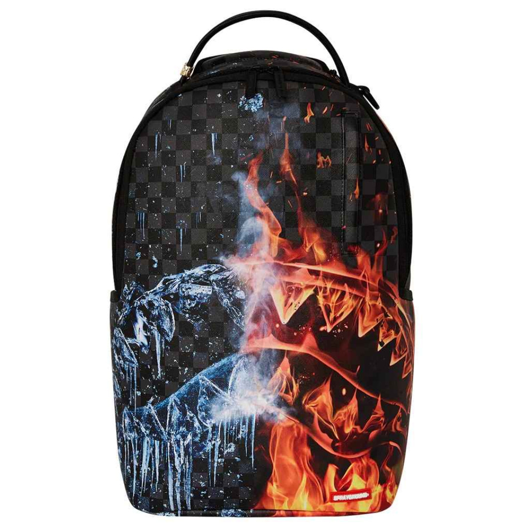 Rucksack Sprayground Fire and Ice Shark DLXSV ist ein gewagtes und einzigartiges Modeaccessoire, das glühende Feuerzähne mit polarblauem Eis kombiniert und so einen außergewöhnlichen visuellen Kontrast und den unverwechselbaren „Wow“-Effekt von Spraygroun