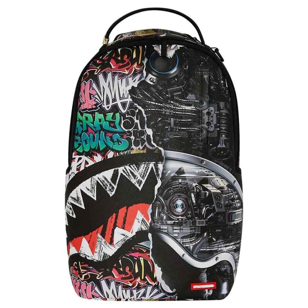 Rucksack Sprayground Split Cybershark Dlxsv ist mutig und auffällig und kombiniert Street Art und futuristisches Design. Mit einzigartigen Grafiken verbindet der Rucksack Graffiti-Motive mit Details. Aus strapazierfähigem, wasserabweisendem Synthetikmater