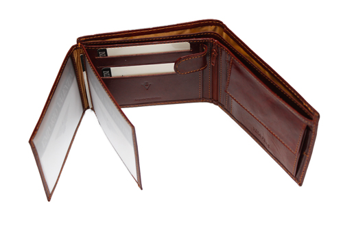Kožni muški novčanik Emporio Valentini 563-261 izrađen je od sijajne kože. Na prvi pogled se primjećuje, da je novčanik napravljen vrlo pažljivo i promišljeno. Odlično estetski izrađen i funkcionalno koncipiran omogućava pohranu svih vrsta dokumenata i novca, kako papirnatog, tako i kovanica. Koža je perfektno obrađena i zašivena. Reference ovoga novčanika su takve, da ga ubrajamo u vrhunske proizvode svoje grupe. Sigurno će biti vrlo zahvalan suputnik svakome muškarcu.