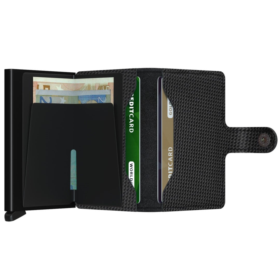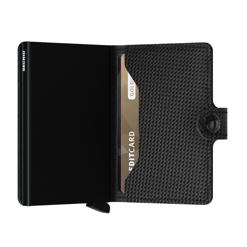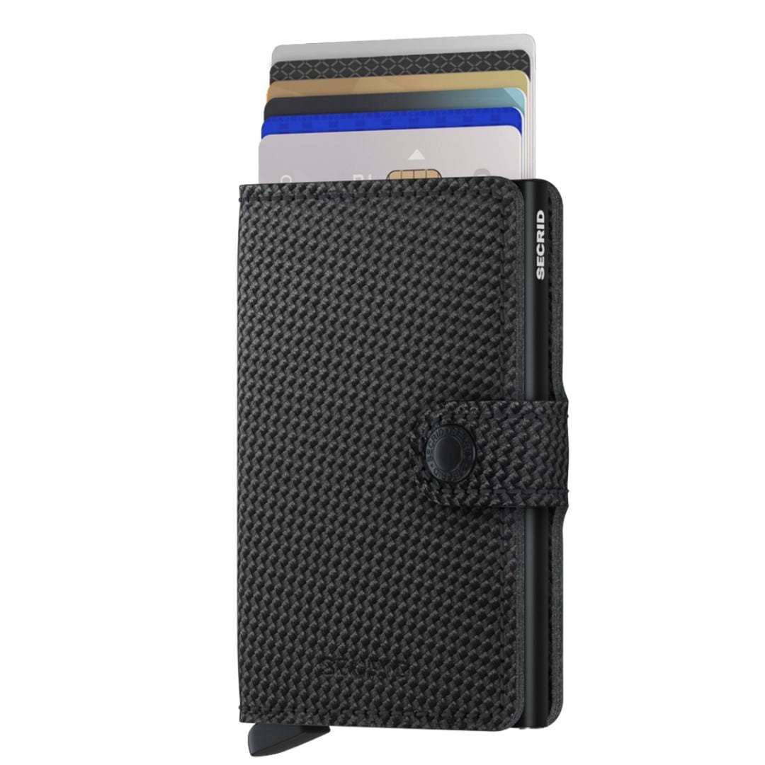 Kožni etui kartice Secrid Mini Carbon je najpoznatiji svestrani kožni novčanik opremljen RFID zaštitom od krađe. Aluminijski Cardprotector srce je minimalističkog novčanika, koji ima patentirani klizni sustav koji omogućuje izvlačenje kartica jednim jednostavnim pokretom i štiti ih od savijanja, lomljenja, a RFID zaštita štiti karticu od neželjenog skeniranja. Cardprotector je dobio Red Dot Design Award 2009. Također sadrži skriveni pretinac za pohranu novčanica. Kožni remen dodatno štiti sadržaj od ispadanja. Praktičan i moderan izgled te za svaki džep bez obzira na spol korisnika.