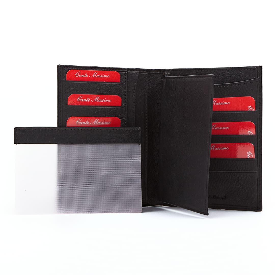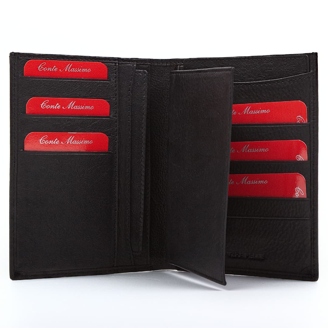 Muški kožni novčanik Conte Massimo Cards tanak, ručno rađen kožni novčanik s nevjerojatnom količinom prostora za kartice i dokumente. Zbog uspravnog rasporeda i praktičniji za udobno skladištenje vaših novčanica. Vrlo mekan i ugodan na dodir.