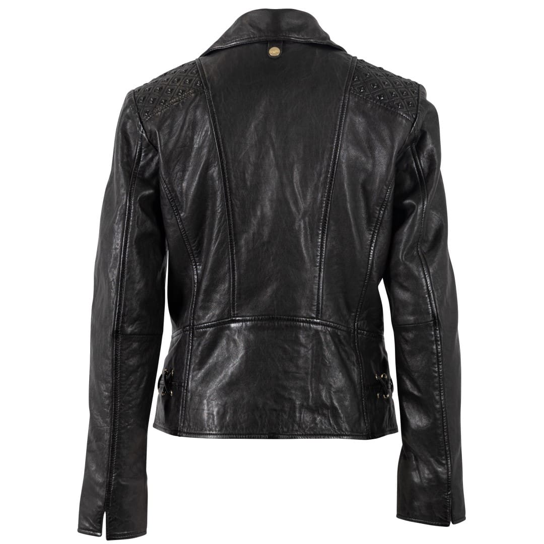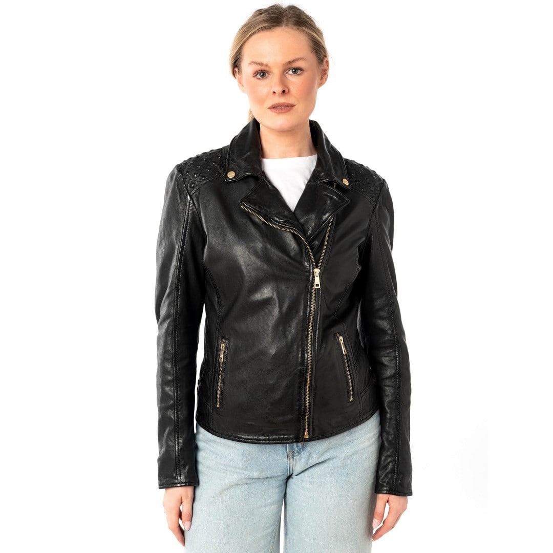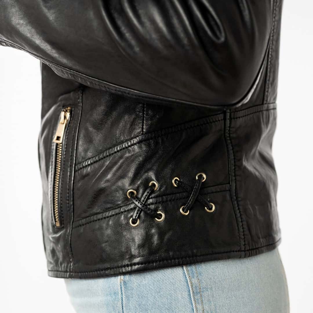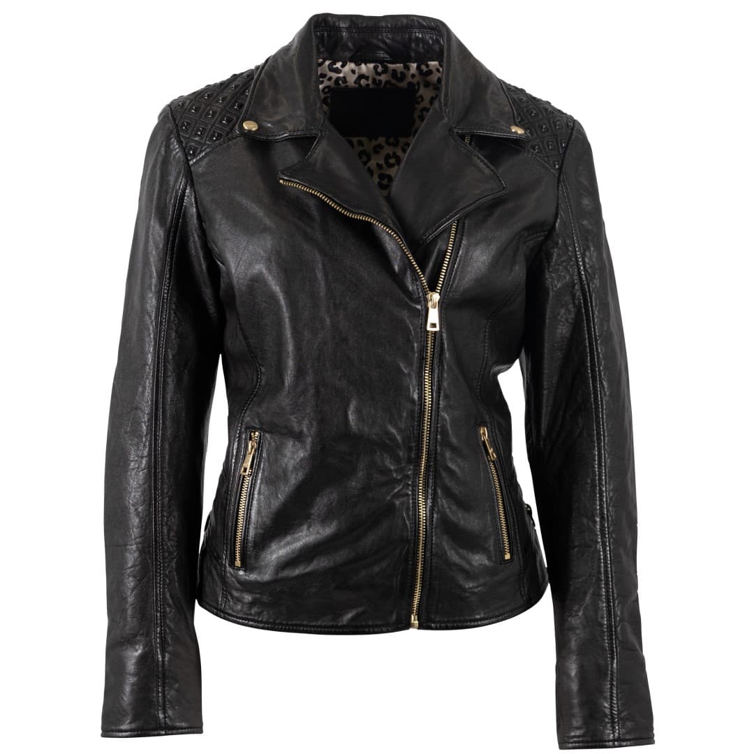 Ženska kožna jakna MAURITIUS Chlara u elegantnoj crnoj boji kreirana je za žene koje u svakom trenutku žele izraziti svoju snagu, ženstvenost i osobni stil. Izrađena je od vrhunske mekane ovčje kože koja savršeno pristaje uz tijelo i pruža udobnost tijekom svih godišnjih doba. Lagano krojen kroj naglašava siluetu, a dvostruki ovratnik i asimetrični zlatni patentni zatvarač stvaraju prepoznatljiv, modno osviješten izgled. Ukrasni prošiveni detalji na ramenima i bokovima daju dašak jedinstvenosti, dok zlatni dodaci stvaraju luksuzni kontrast crnoj koži. Unutrašnjost sa životinjskim uzorkom otkriva razigranu stranu vašeg karaktera koja se skriva ispod bezvremenske elegancije vanjštine. Ova jakna iznimno je svestrana - savršena uz traperice i gležnjače, elegantnu suknju ili poslovne hlače. Bez obzira na priliku, u njemu ćete uvijek zračiti samopouzdanjem, stilom i odvažnom elegancijom. Jednostavno jakna koja upada u oči i ostaje dugo u sjećanju.