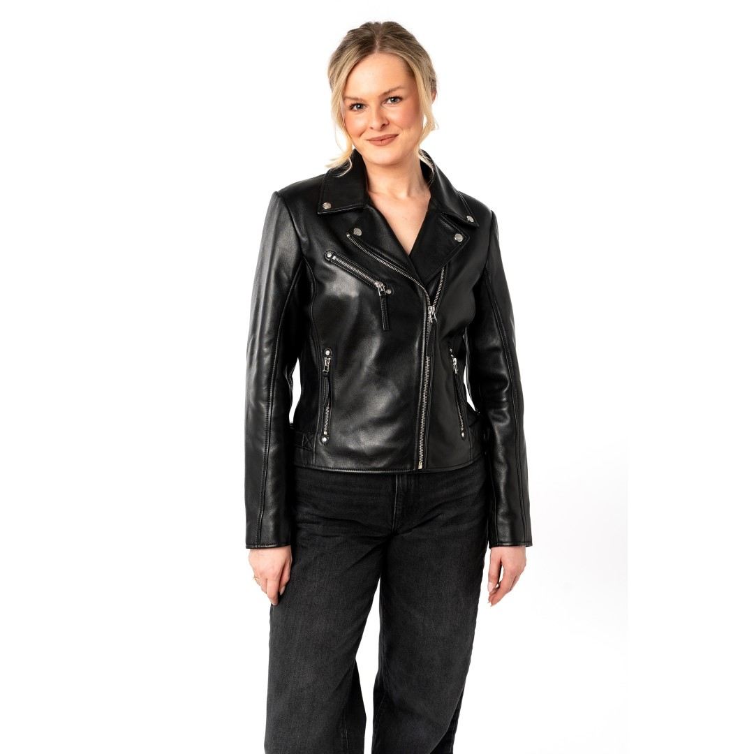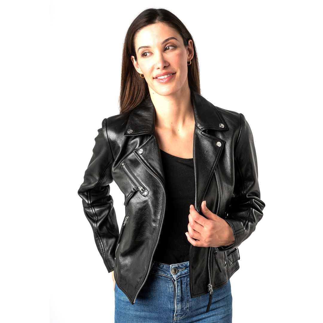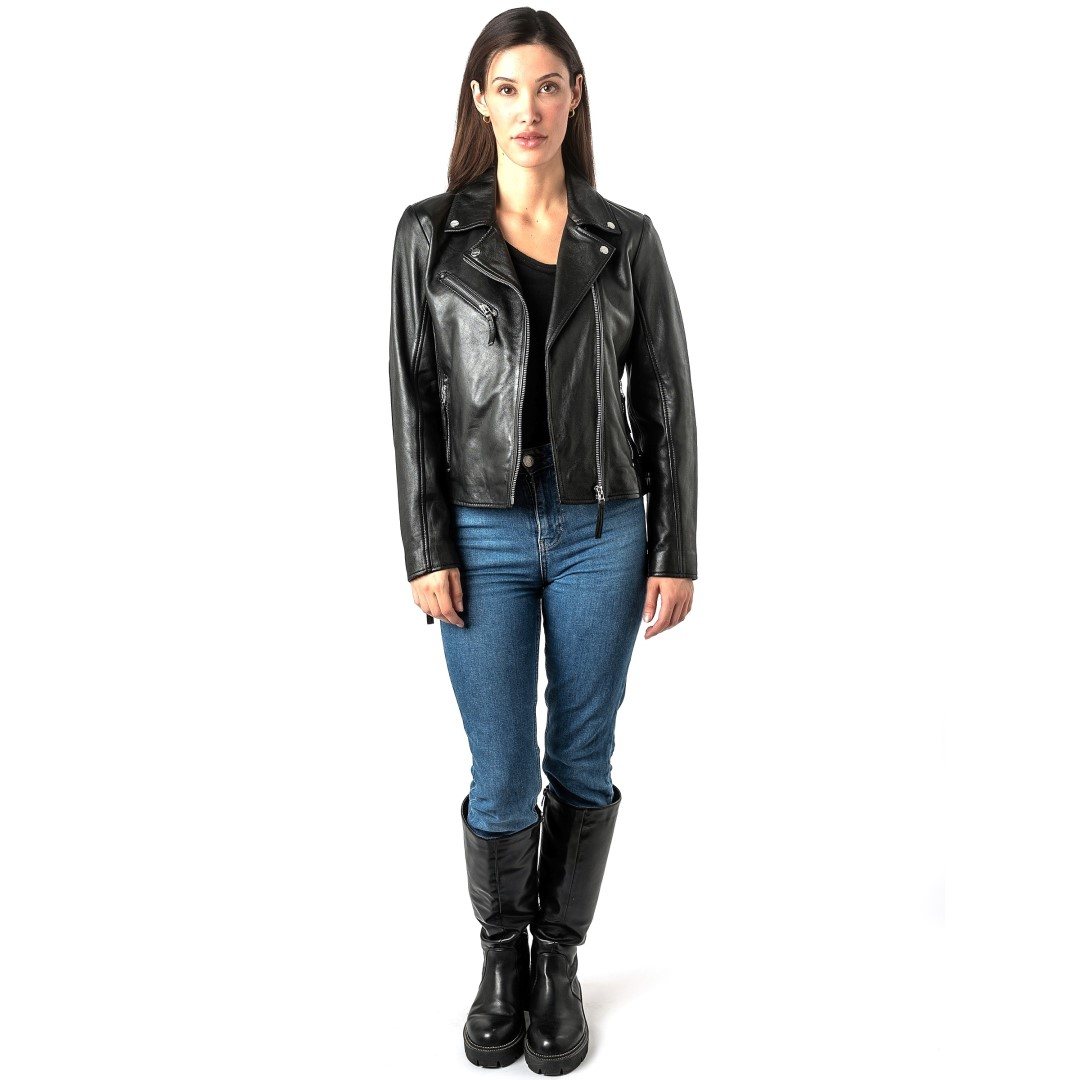 Ženska kožna jakna MAURITIUS Pasja je elegantna ženska kožna jakna klasičnog bajkerskog kroja s asimetričnim patentnim zatvaračem i metalnim detaljima. Izrađena je od visokokvalitetne prave kože, krojena u blago pripijenoj liniji koja naglašava ženstvenu siluetu i lijepo pristaje figuri. Karakterističan asimetrični patentni zatvarač, moderna dvostruka kragna s ukrasnim gumbima i sofisticirani dodaci daju jakni prepoznatljiv "rock-chic" izgled. Crna i krem boja su bezvremenske i omogućuju jednostavno kombiniranje - od svakodnevnog urbanog outfita s trapericama i tenisicama, do večernje modne kombinacije sa suknjom ili elegantnim hlačama. Izvrsna je za one koji cijene kvalitetu i jedinstvene detalje u svojoj odjeći. Ženska kožna jakna savršen je izbor za sve one koji vole kombinaciju klasične elegancije i odvažnog stila.