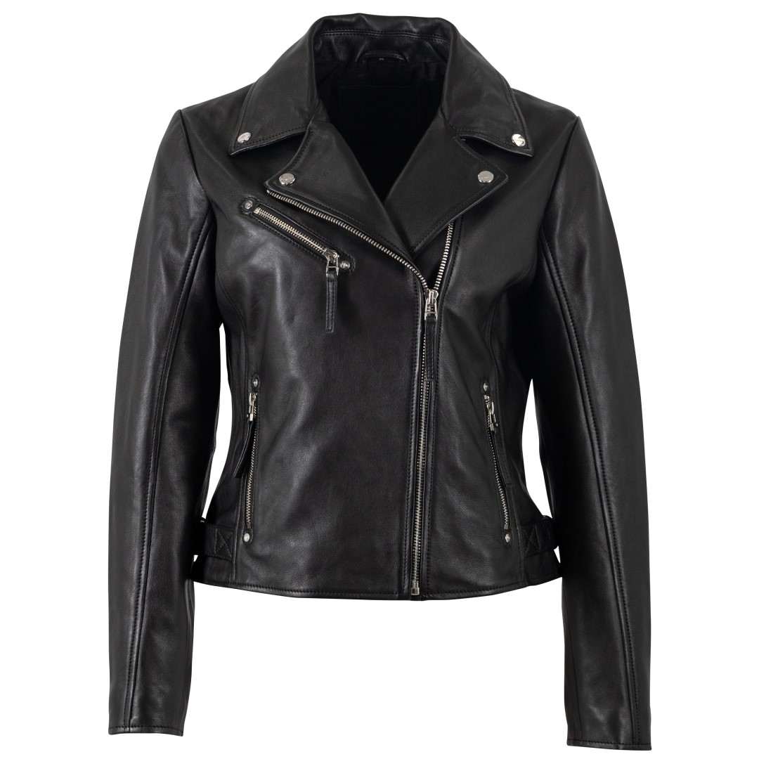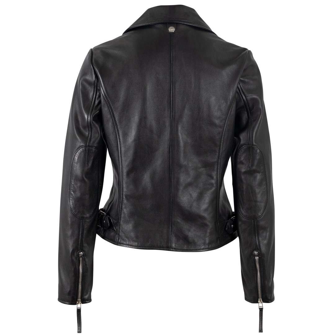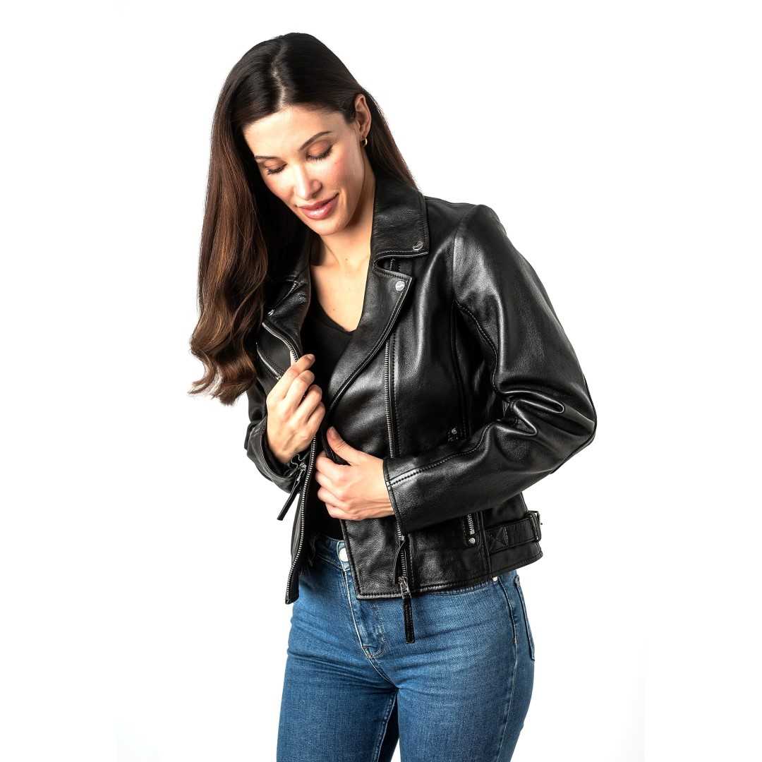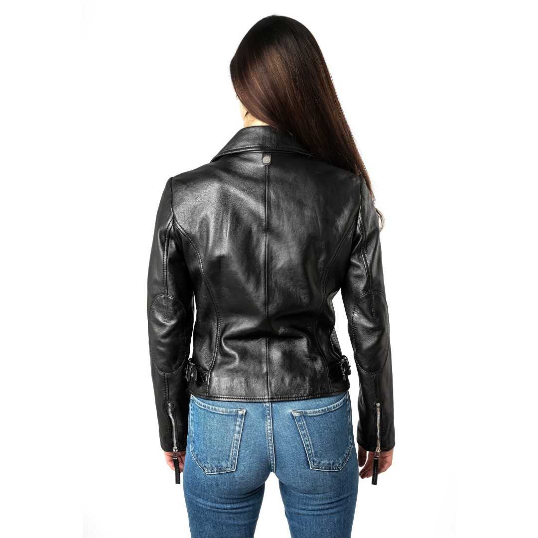 Ženska kožna jakna MAURITIUS Pasja je elegantna ženska kožna jakna klasičnog bajkerskog kroja s asimetričnim patentnim zatvaračem i metalnim detaljima. Izrađena je od visokokvalitetne prave kože, krojena u blago pripijenoj liniji koja naglašava ženstvenu siluetu i lijepo pristaje figuri. Karakterističan asimetrični patentni zatvarač, moderna dvostruka kragna s ukrasnim gumbima i sofisticirani dodaci daju jakni prepoznatljiv "rock-chic" izgled. Crna i krem boja su bezvremenske i omogućuju jednostavno kombiniranje - od svakodnevnog urbanog outfita s trapericama i tenisicama, do večernje modne kombinacije sa suknjom ili elegantnim hlačama. Izvrsna je za one koji cijene kvalitetu i jedinstvene detalje u svojoj odjeći. Ženska kožna jakna savršen je izbor za sve one koji vole kombinaciju klasične elegancije i odvažnog stila.