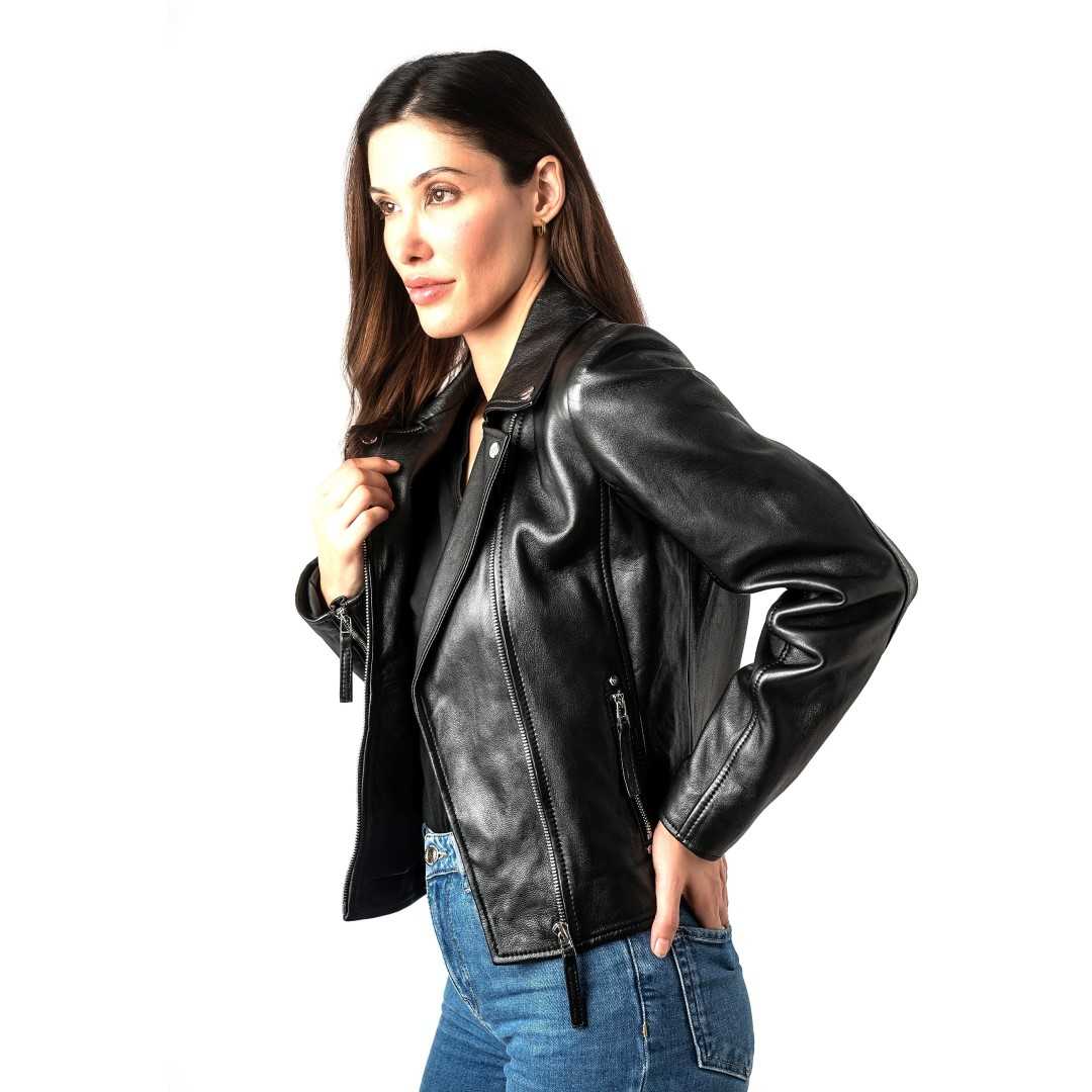 Ženska kožna jakna MAURITIUS Pasja je elegantna ženska kožna jakna klasičnog bajkerskog kroja s asimetričnim patentnim zatvaračem i metalnim detaljima. Izrađena je od visokokvalitetne prave kože, krojena u blago pripijenoj liniji koja naglašava ženstvenu