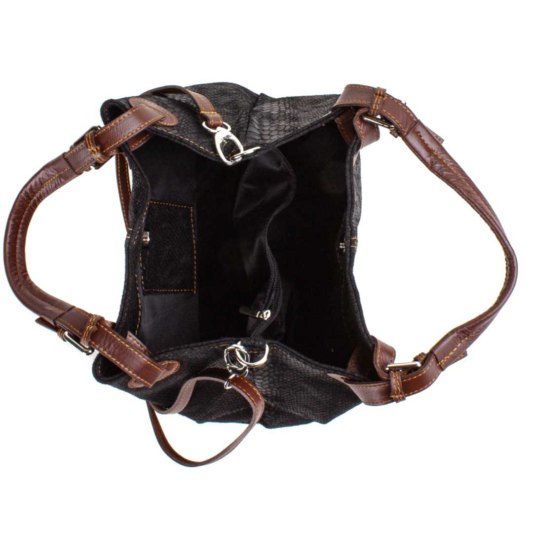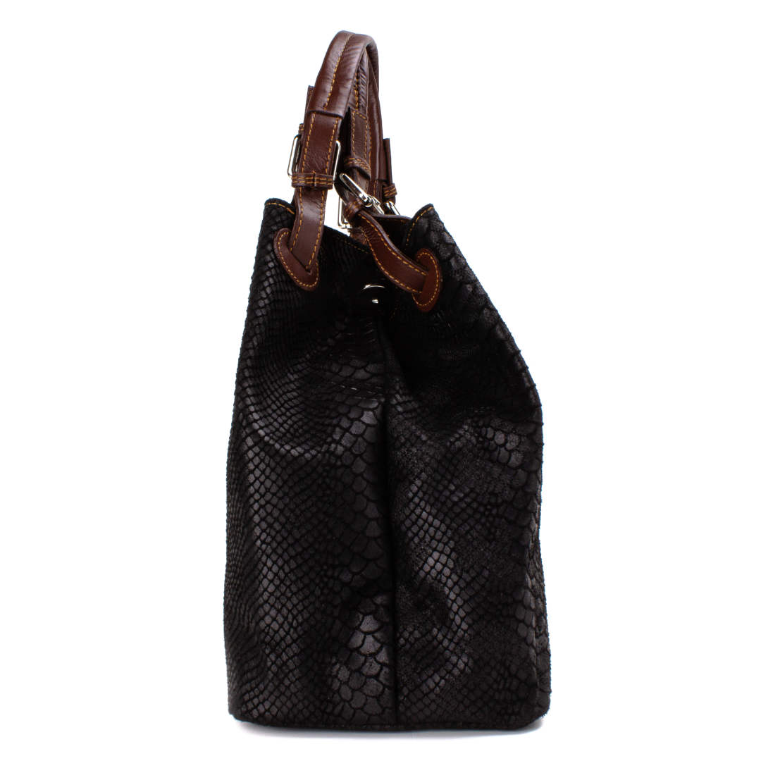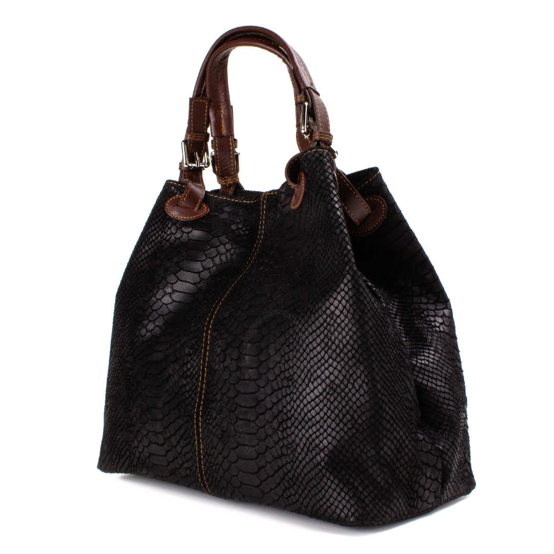 Ženska kožna modna torba Optimist Isla pogodna je za sva godišnja doba i za svaku ženu koja voli biti lijepo uređena i prati modne trendove. Izrađena je od najfinije goveđe kože, sa prešanim "trendy modernim" uzorkom u obliku zmijske ljuske.