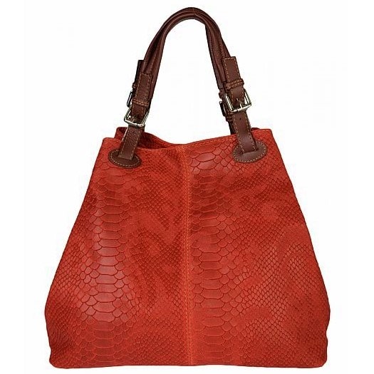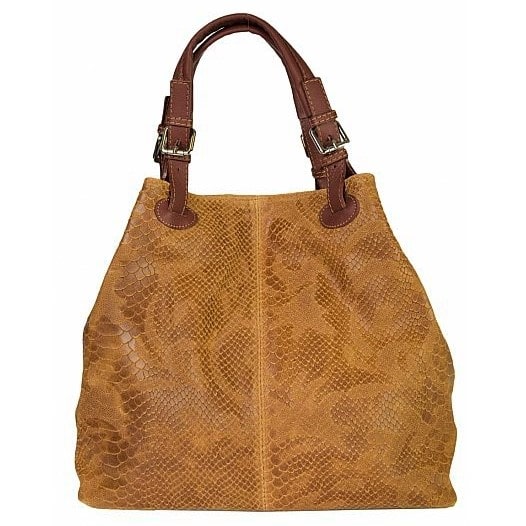 Ženska kožna modna torba Optimist Isla pogodna je za sva godišnja doba i za svaku ženu koja voli biti lijepo uređena i prati modne trendove. Izrađena je od najfinije goveđe kože, sa prešanim "trendy modernim" uzorkom u obliku zmijske ljuske. Srednje veličine, upotrebljiv volumen od 3 pretinaca s 2 unutarnja džepa i gornjim zatvaračem na magnet. S dvije snažne ručke može se nositi u ruci ili s podesivim naramenicom. Savršeno pristaje uz traperice i čizme, kao i uz elegantnije odjevne komade. Otkrijte izdržljivu torbicu robusnog ručnog rada i ekskluzivnog dizajna u toplim jesenskim nijansama!