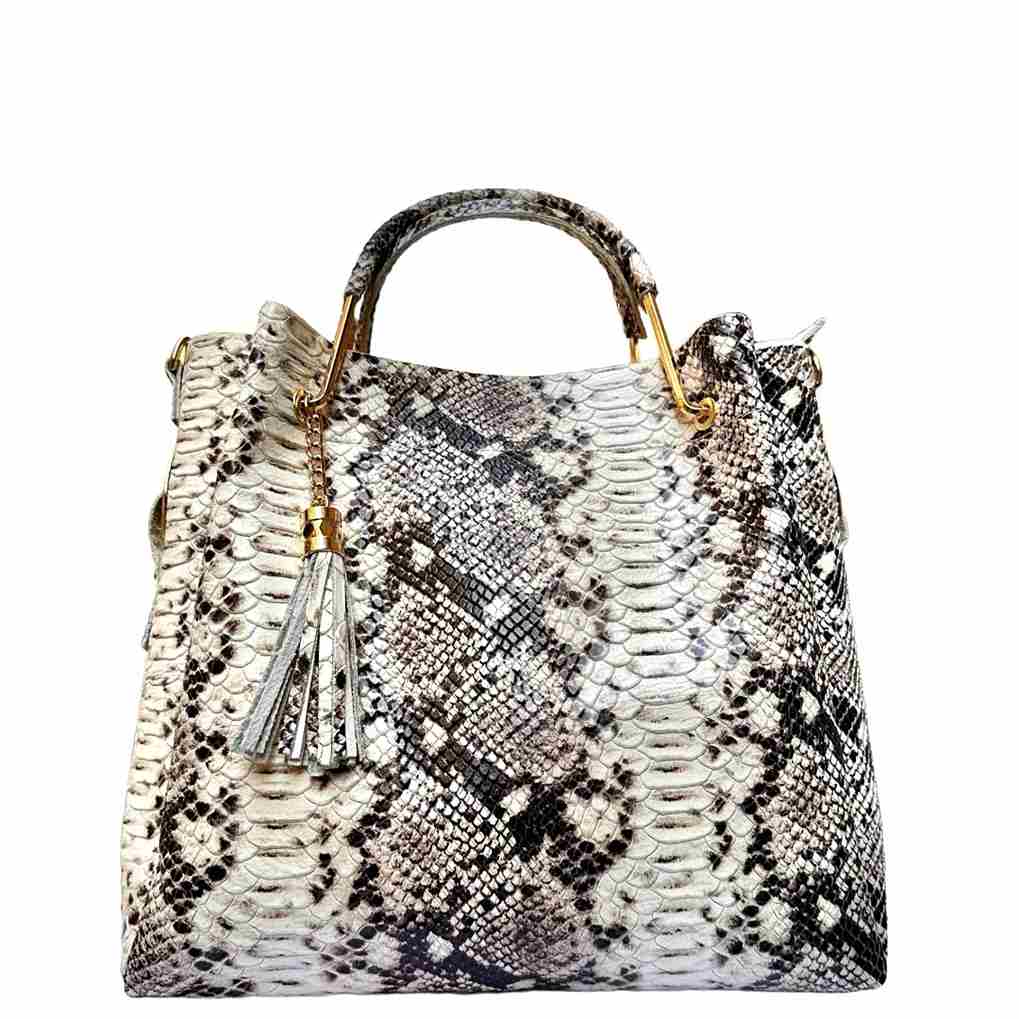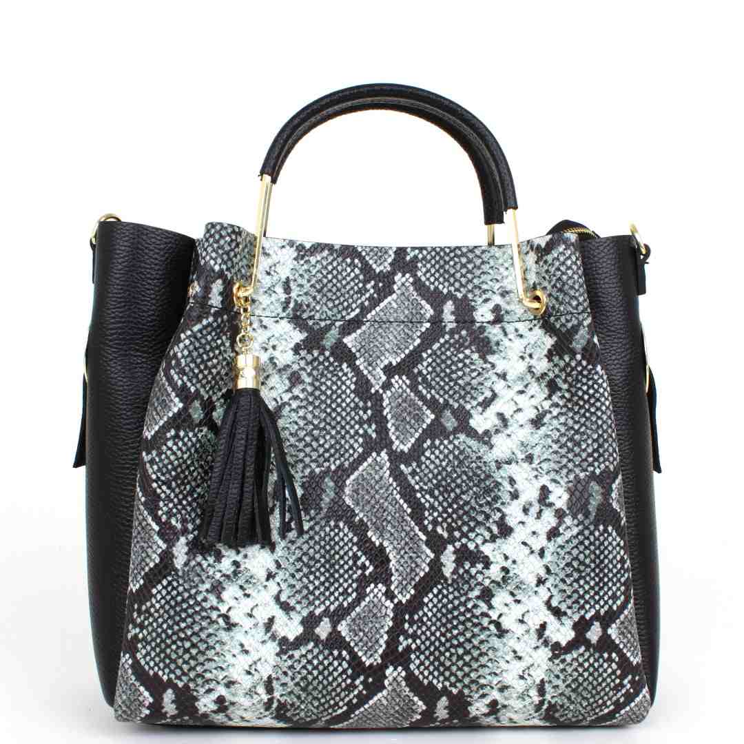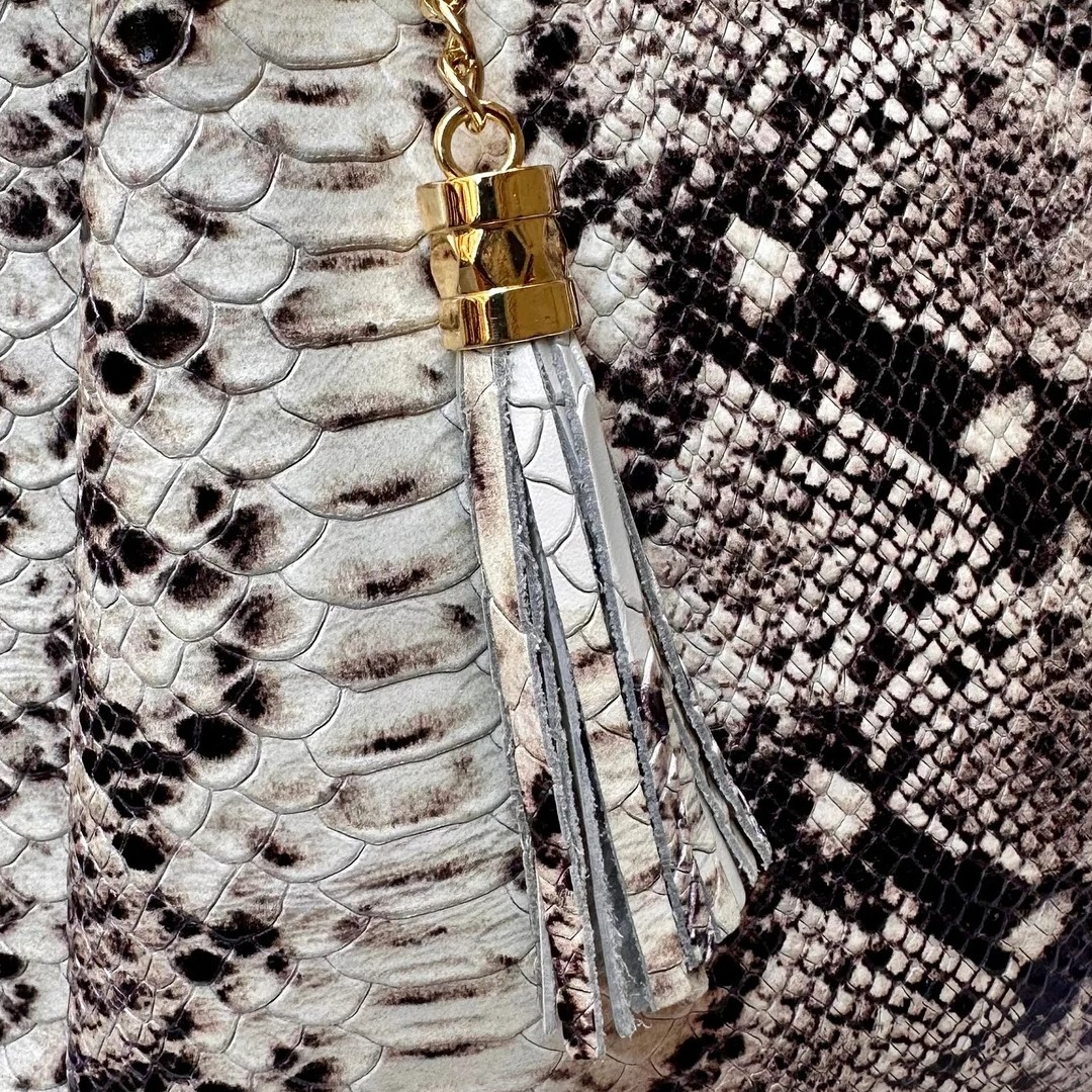 Ženska kožna modna torba Optimist Zoe impresionira svojim bezvremenskim dizajnom, talijanskom izradom i vrhunskom pravom goveđom kožom u izgledu pitona. Njegova profinjena tekstura i metalni dodaci u boji zlata daju mu dašak pravog luksuza koji nadopunjuje svaki modni stil - od klasičnog do suvremenog. Torba se tradicionalno izrađuje u Firenci. Uz kompaktne dimenzije (32 × 30 × 14 cm) i promišljenu unutrašnjost, nudi savršenu ravnotežu između elegancije i praktičnosti. Glavni pretinac dopunjen je uklonjivom unutarnjom torbicom s patentnim zatvaračem koja služi i kao pregrada, dok zlatni detalji, robusne ručke i zaštitne nožice osiguravaju dugotrajnu izdržljivost i elegantan izgled. Torbica se može nositi na nekoliko načina - elegantno u ruci, preko ramena ili dijagonalno s skidivom naramenicom. Dostupno u dvije prekrasne boje: bež i crnoj, savršeno se prilagođava vašem osobnom stilu i prilici - od poslovnih sastanaka do večernjih izlazaka. Ženska kožna torba Optimist – izraz luksuza, odvažnosti i bezvremenske elegancije.