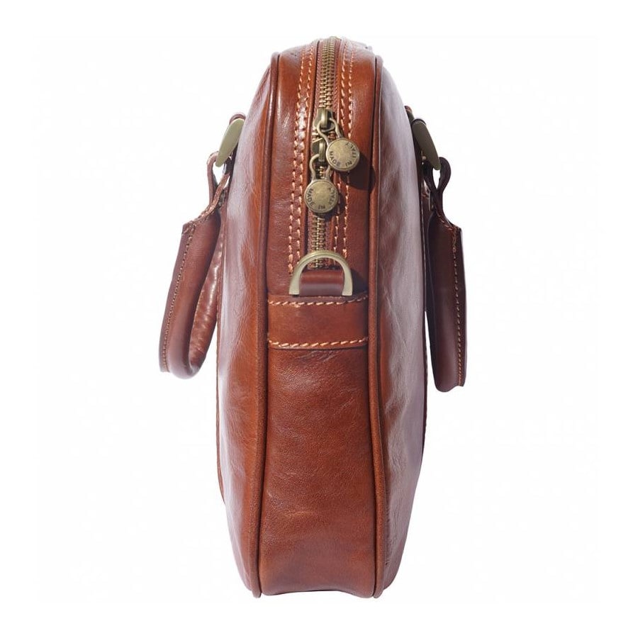 Kožna poslovna torba Optimist Cure vrhunski ručno izrađen proizvod od biljno preplanule teleće kože, ekstra je vrijednost osobnog imidža u poslovnom svijetu. Sadrži glavni pretinac s patentnim zatvaračem, 2 unutarnja bočna džepa za telefon ili novčanik, veći unutarnji džep s patentnim zatvaračem i podstavljeni prostor za manji laptop. S jakim zaokruženim ručkama može se nositi u ruci ili s podesivom naramenicom. Zbog zanimljivog retro dizajna savršeno se slaže i s elegantnim i sa sportskim izgledom.