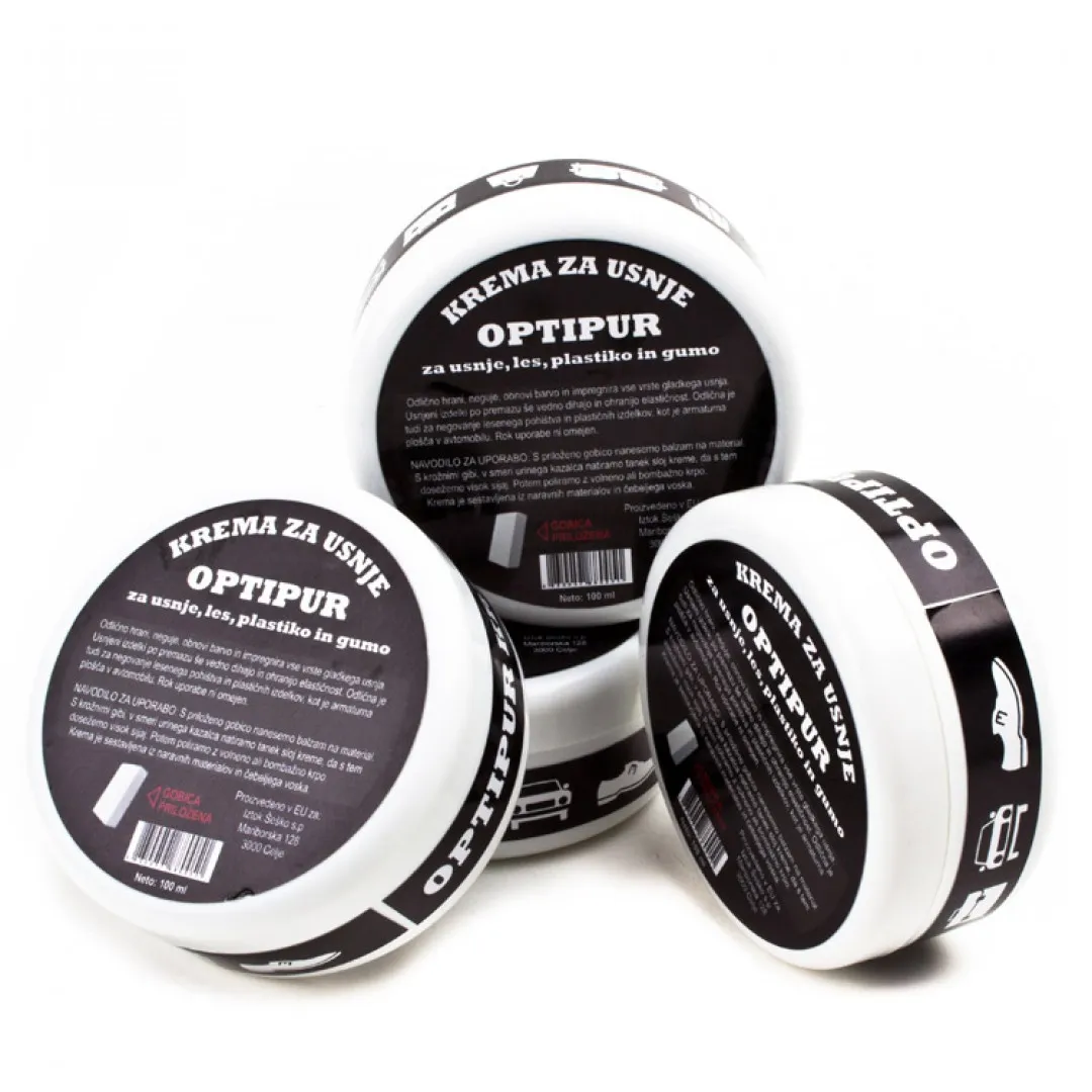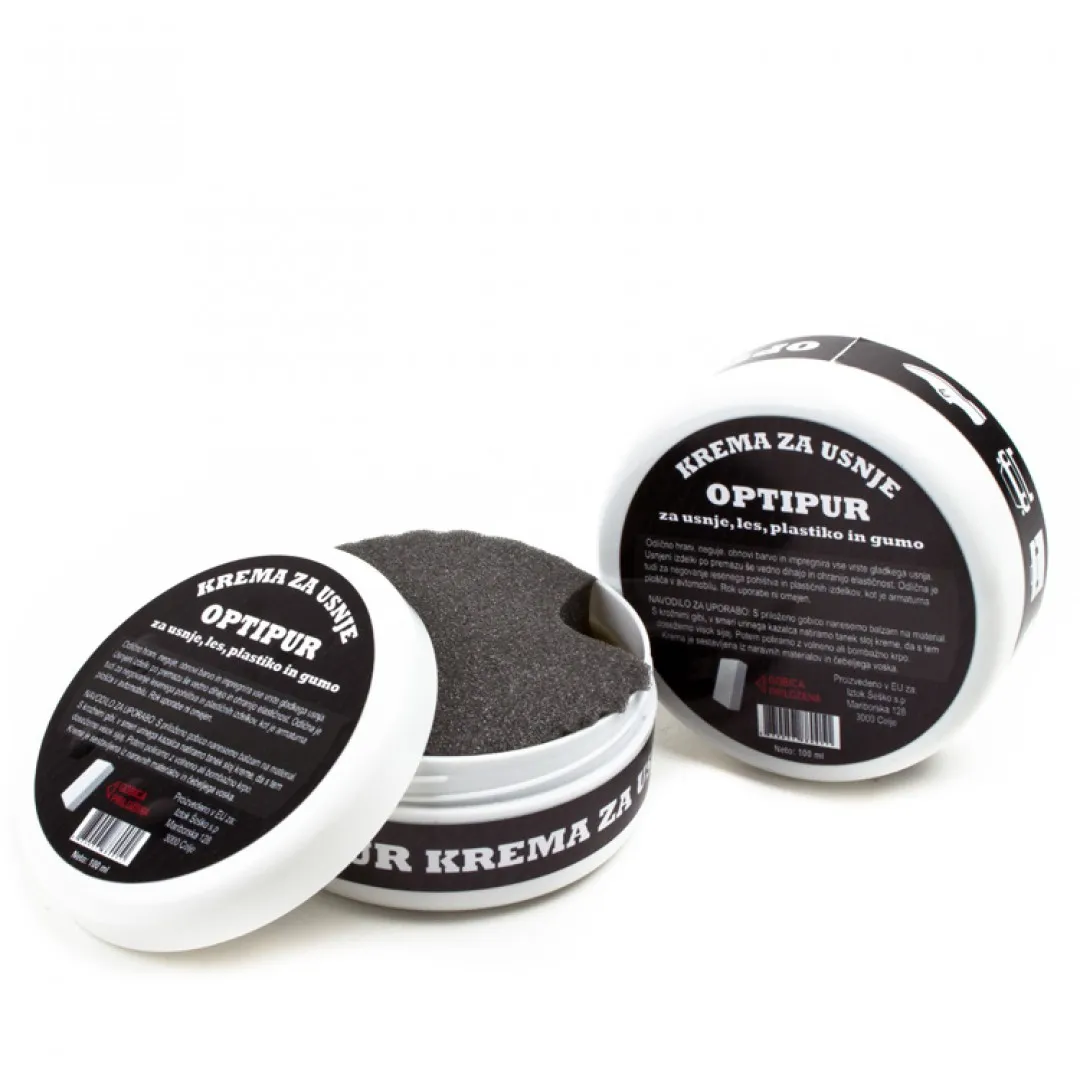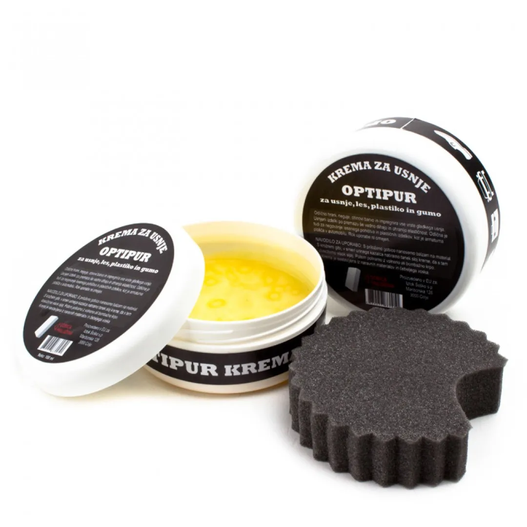 Krema za usnje Optipur 3830057880051 odlično hrani, neguje, obnovi barvo in impregnira vse vrste gladkega usnja, ter je brezbarvna. Usnjeni izdelki po premazu še vedno dihajo in ohranijo elastičnost. Odlična je tudi za negovanje lesenega pohištva in plastičnih izdelkov, kot je armaturna plošča v avtomobilu. Kremi je priložena tudi gobica. Rok uporabe ni omejen.