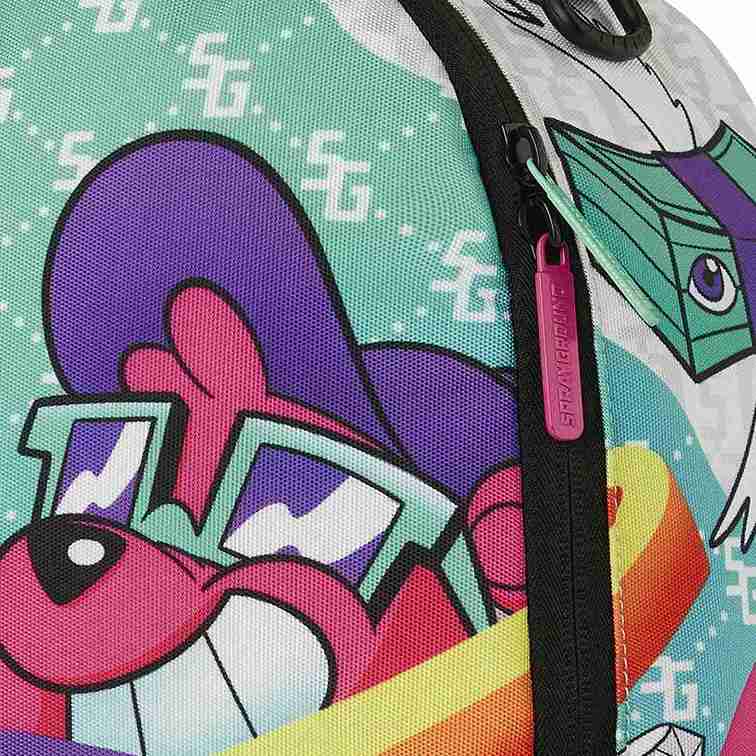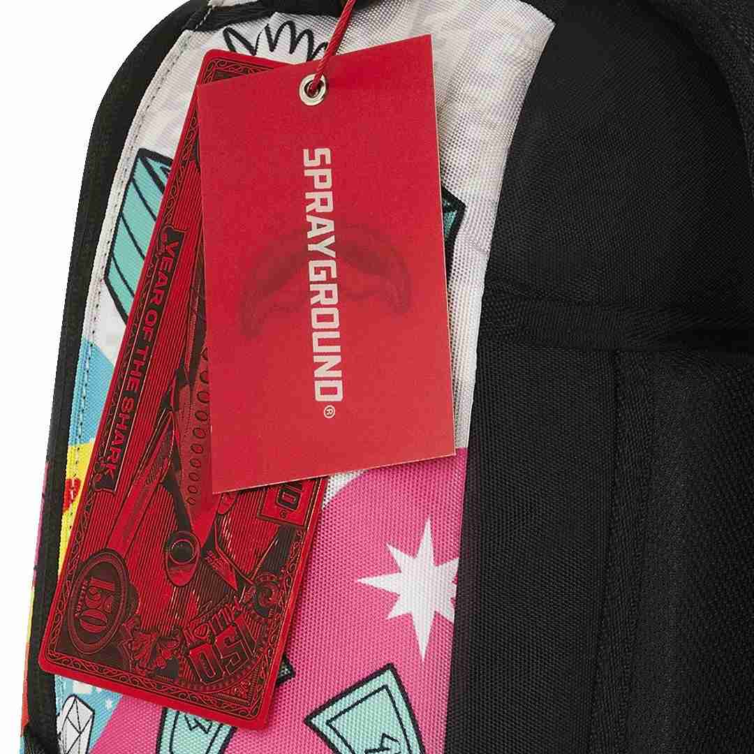 Nahrbtnik Sprayground Street Art Inspired Concepts z vpadljivm street-art motivom združuje igrivo drznost, pop-art estetiko in ikonično “shark mouth” grafiko, ki je zaščitni znak znamke. Dinamična kombinacija živih barv, risanih likov, denarnih motivov in
