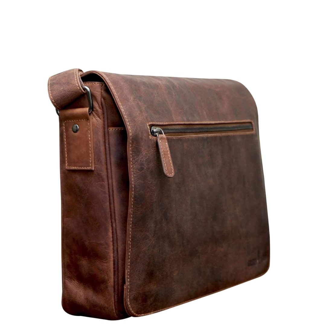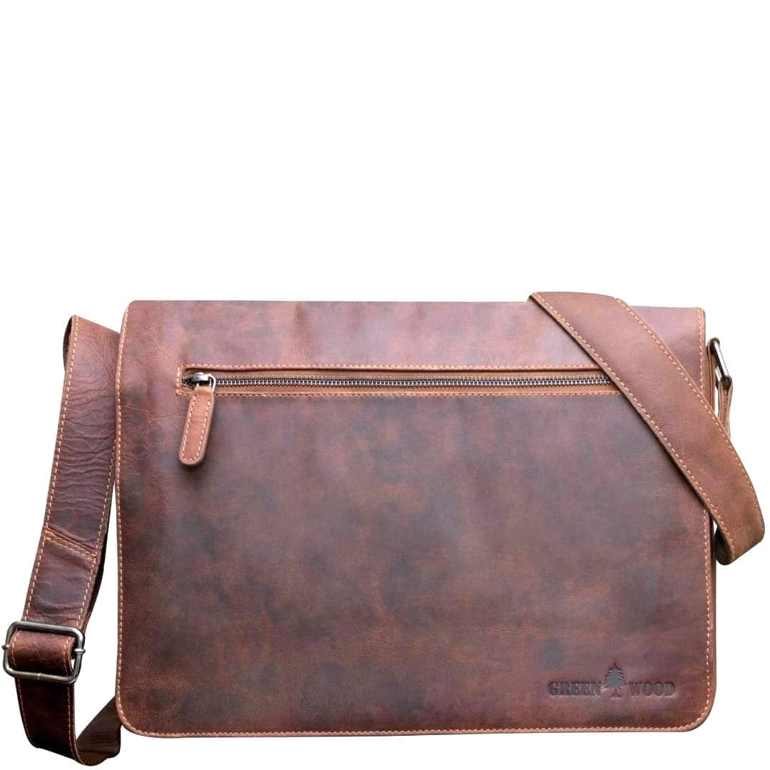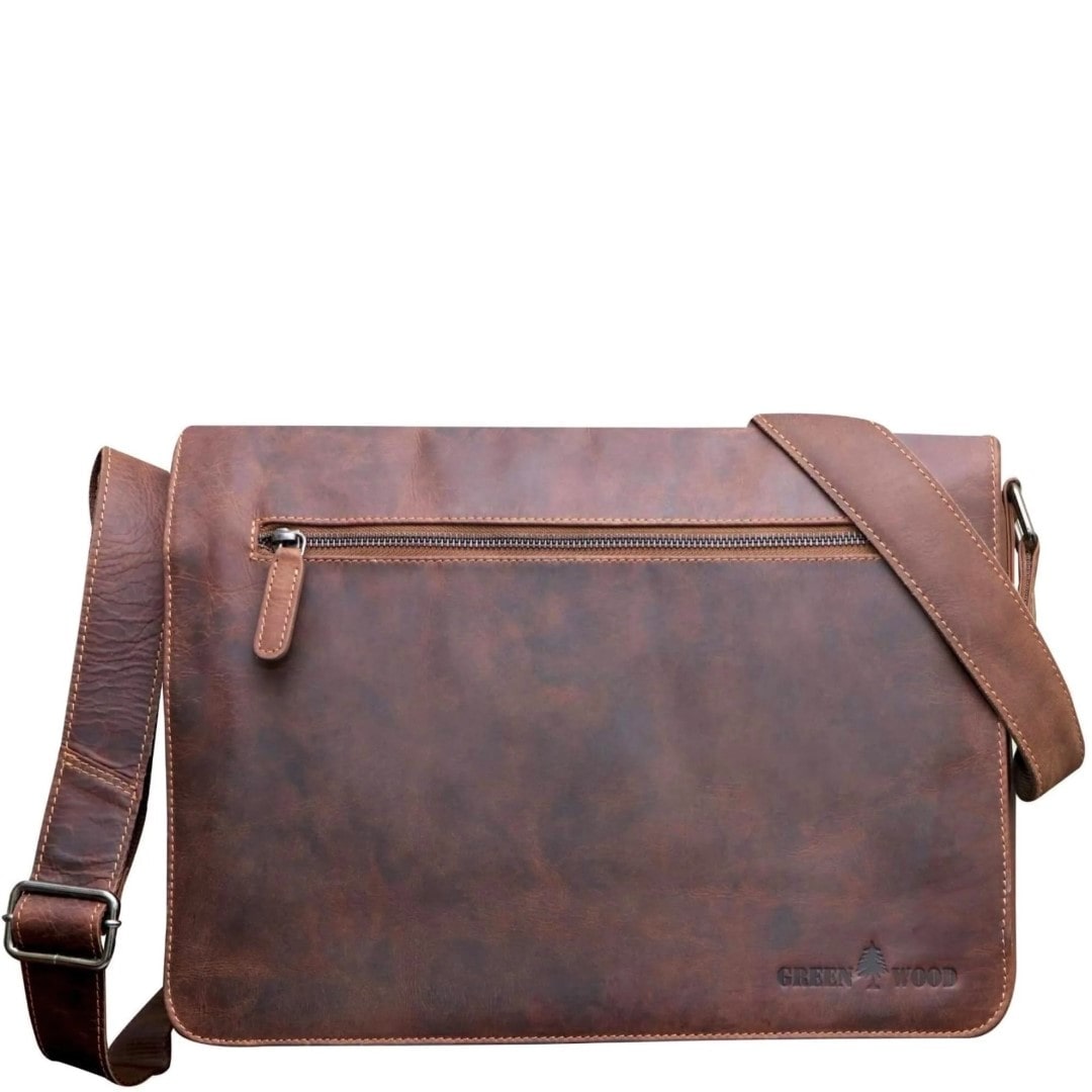 Usnjena poslovna torba Green Wood Finn je ročno izdelana torba iz visokokakovostnega usnja in navdušuje v videzu z "rabljenim izgledom", notranjost torbe pa je obložena s kvalitetno tkanino. Torba je sestavljena iz dveh glavnih predalov, kjer lahko shranite dokumente, poslovne mape, knjige, računalniško tablico ali 14-palčni prenosni računalnik. Žep na prednji strani vam služi kot prostor za pisala, vizitke, denarnico ter mobilni telefon. Na pokrovu torbe in na zunanji zadnji strani sta večja žepa na zadrgo. Pokrov torbe se zapira z dvema magnetnima sponkama na pritisk. Ima širok, prilagodljiv tekstil/usnje ramenski trak. Vsaka torba je izdelana ročno in je zato popolnoma individualna, nepravilna zrnatost in morebitna odrgnina barve nista napaka, temveč jamstvo za pristnost. Usnjene poslovne torbe so za vse, ki imajo radi vrhunske izdelke ročne izdelave z izjemno dolgo življenjsko dobo.