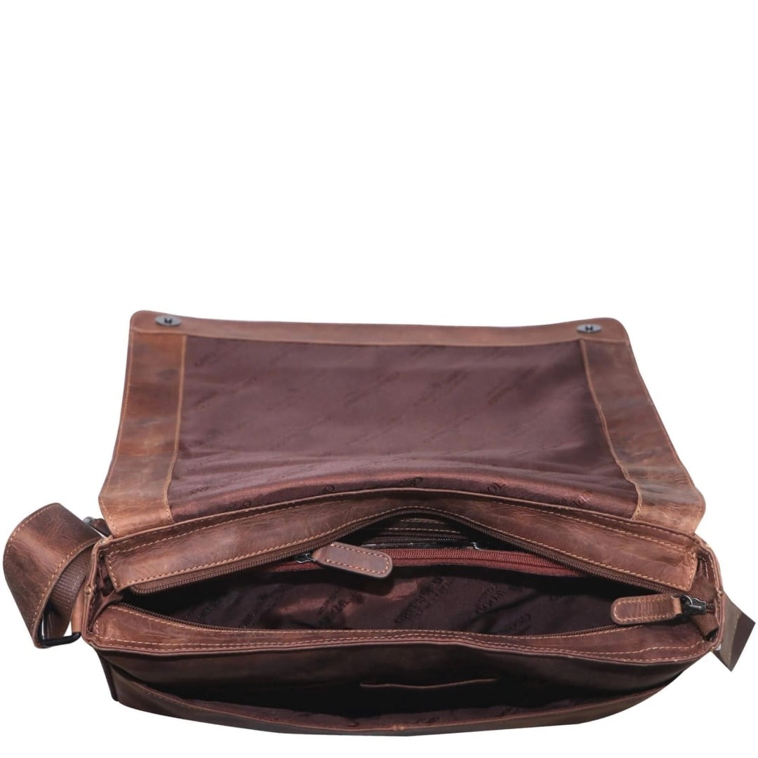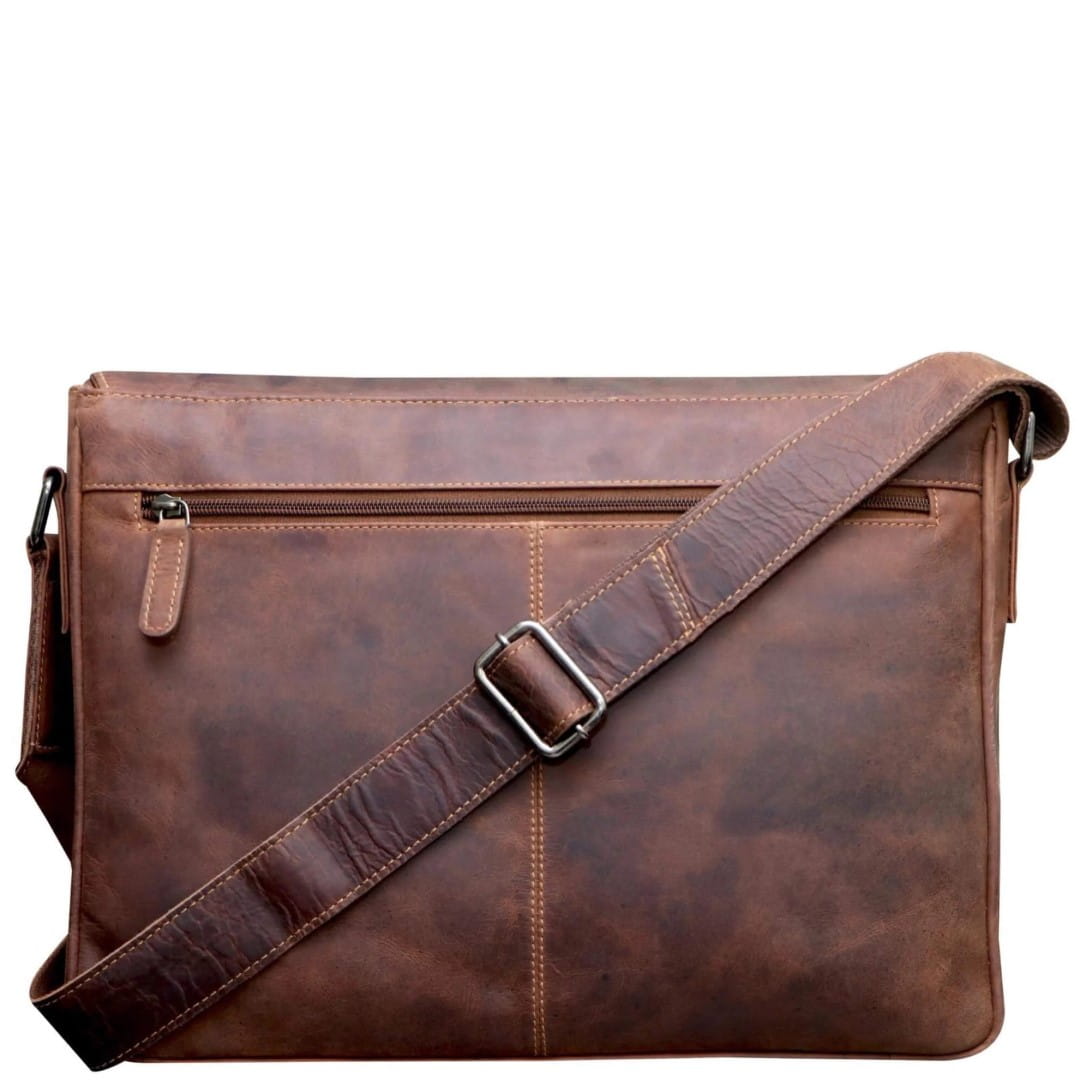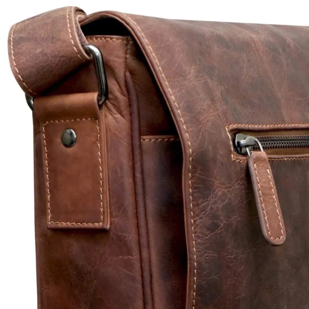 Usnjena poslovna torba Green Wood Finn je ročno izdelana torba iz visokokakovostnega usnja in navdušuje v videzu z "rabljenim izgledom", notranjost torbe pa je obložena s kvalitetno tkanino. Torba je sestavljena iz dveh glavnih predalov, kjer lahko shranite dokumente, poslovne mape, knjige, računalniško tablico ali 14-palčni prenosni računalnik. Žep na prednji strani vam služi kot prostor za pisala, vizitke, denarnico ter mobilni telefon. Na pokrovu torbe in na zunanji zadnji strani sta večja žepa na zadrgo. Pokrov torbe se zapira z dvema magnetnima sponkama na pritisk. Ima širok, prilagodljiv tekstil/usnje ramenski trak. Vsaka torba je izdelana ročno in je zato popolnoma individualna, nepravilna zrnatost in morebitna odrgnina barve nista napaka, temveč jamstvo za pristnost. Usnjene poslovne torbe so za vse, ki imajo radi vrhunske izdelke ročne izdelave z izjemno dolgo življenjsko dobo.