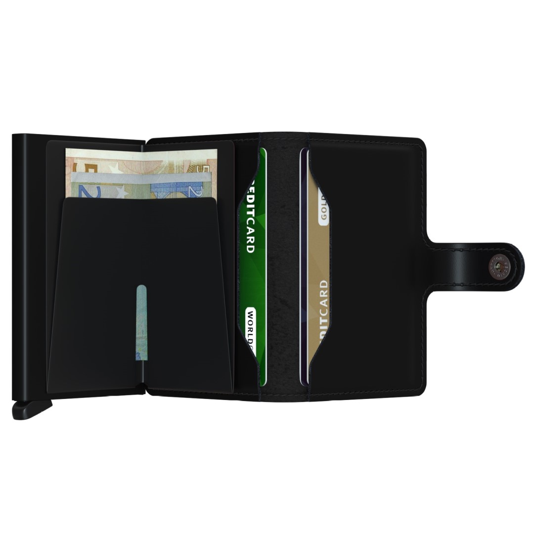 Usnjen etui za kartice Secrid Mini Matte majhen, vsestranski, kompaktne oblike in presenetljivo velik po zmogljivosti shranjevanja. Izdelan iz visokokakovostnega usnja in opremljen z RFID zaščito pred krajo elektronskih podatkov. Aluminijast Cardprotector omogoča, da izvlečete kartice z enim preprostim gibom in jih ščiti pred upogibanjem, zlomom in z RFID zaščito kartice zaščitimo pred neželenim skeniranjem. Vsebuje tudi skriti prostor za shranjevanje bankovcev. Usnjen pasek pa dodatno ščiti vsebino pred izpadanjem. Praktična in modnega videza ter primerna za vsak žep ne glede na spol uporabnika.